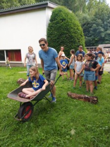 Ein besonderes Highlight war der Hindernisparcours, der von den Leitern aufgebaut wurde. Die Herausforderung bestand darin, den Parcours in einer Schubkarre zurückzulegen. Dabei mussten die Teilnehmer Geschicklichkeit und Teamarbeit unter Beweis stellen, um die verschiedenen Hindernisse zu überwinden. Dieser Wettbewerb sorgte für viele lustige Momente.