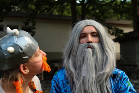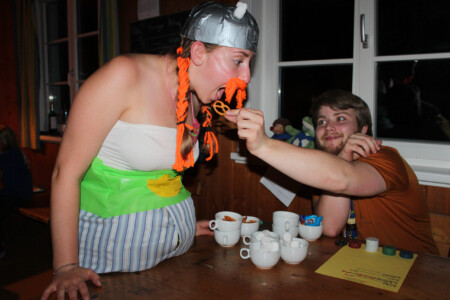 Doch am nächsten Morgen stellten wir fest, dass etwas Unvorhergesehenes passiert war. Der Tag schien aus den Fugen geraten zu sein. Statt eines Frühstücks erwartete uns zunächst eine gallische Disco, und dann gab es in solch früher Stunde auch noch ein festliches Abendessen serviert. Am “Nachmittag” hatten die WiWö Zeit, an ihren Versprechens- und 1. Sternbüchlein zu arbeiten, als sie plötzlich von den Galliern unterbrochen wurden. Miraculix konnte sich erneut ein wenig erinnern – die letzte Zutat war ein Römerhaar! Die WiWö schmiedeten einen gewagten Plan, um die Römer anzulocken, indem sie den verrückten Trank im Dorf offen ausstellten und es dann verließen. Die Hoffnung war, dass die Römer den Trank probieren und dabei unbewusst einige Haare verlieren würden, die dann für den richtigen Trank verwendet werden könnten.