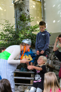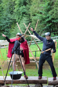 Nach einem herzhaften Mittagessen wurde es plötzlich aufregend. Zwei Römer wurden am Lagerplatz gesichtet! Doch bevor die Aufregung überhandnehmen konnte, stellten sich Asterix und Obelix mutig in den Weg der Eindringlinge und trieben sie erfolgreich davon. Nun war Eile geboten. Wir füllten den verrückten Trank in Wasserbomben ab und lockten die Römer erneut aus dem Wald. Der Plan funktionierte perfekt: Die Römer begannen zu tanzen, und Obelix konnte einige kostbare Haare für den Zaubertrank gewinnen.