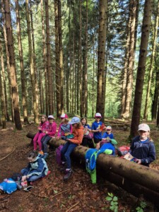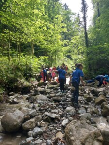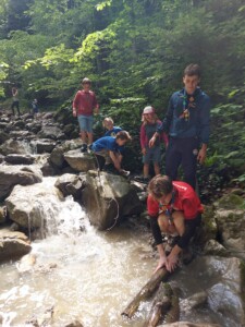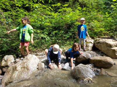 Mit zunehmender Tageswärme ging es für eine kurze Abkühlung an den nahegelegenen Bach. Sie nutzten die Gelegenheit, um kleine Staudämme zu bauen und den Bach zu erkunden.